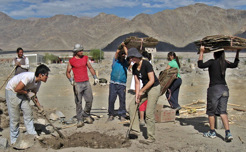 We have been working with the LAMDON school at Thiksey since the last five years, and assisting them in building a hostel block. Student volunteers spend a week at the construction site, laying bricks, chopping wood, and building individual rooms. The students also interact with the students from Lamdon school, with a